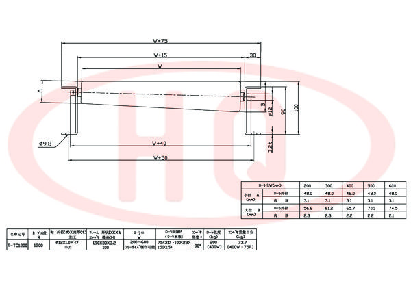 | 型 號 | 轉(zhuǎn)彎半徑 R | 軸外徑(φ)×壁厚(t) 加工 | 支架形狀I×K×t 輸送機(jī)高(H) | 滾 筒 幅 寬 W | 滾筒間距 P (滾筒數(shù)) | 滾筒 角度 θ | 滾筒強(qiáng)度 (kg) | 輸送機(jī)重量 (kg) | |||||